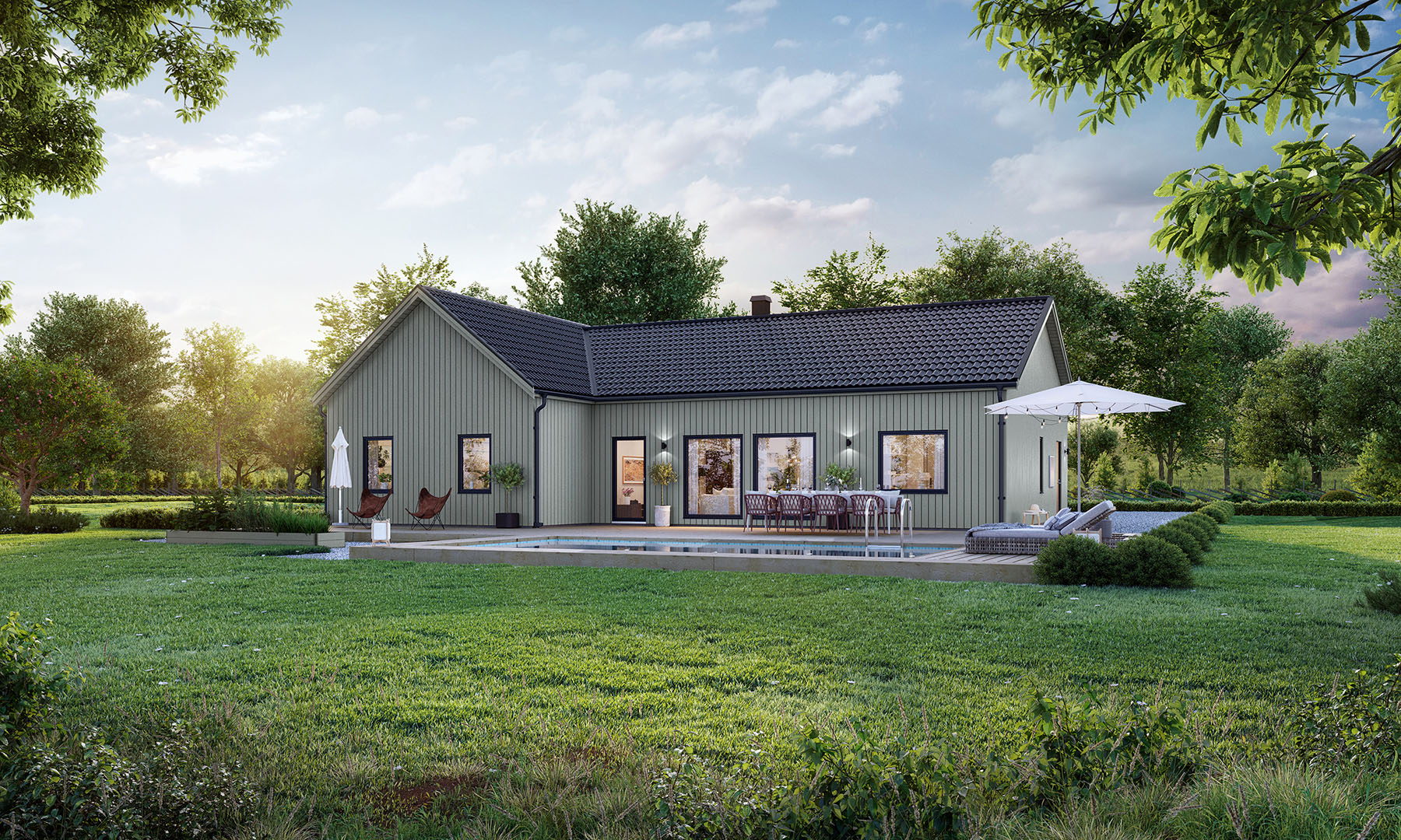 Priset avser standardutförande med vår höga grundstandard på totalentreprenad och inkluderar grundläggning med platta på mark och vattenburen golvvärme samt markarbeten i standardomfattning. Vi förbehåller oss rätten för lokala prisavvikelser med hänsyn till transport- och tillgänglighetssvårigheter, så som vid bl a bro-, tunnel- eller färjeanslutna ögrupper.