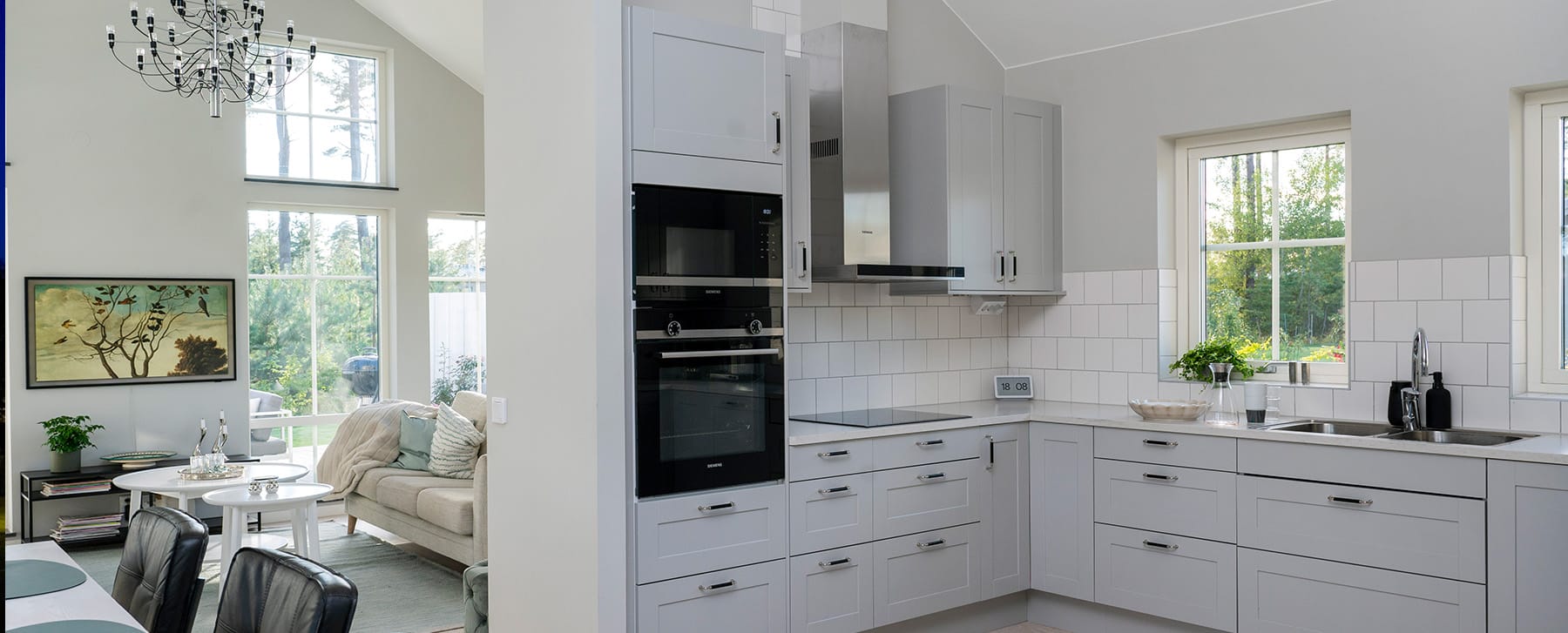 – Vi båda trivs allra bäst i det stora vardagsrummet, det har en så härlig rymd med vårt tillvalda ryggåstak, och så tallarna utanför… Vi gillar också köket i anslutning till det. Det är öppet men också lite avskärmat, så man kan härja fritt och samtidigt ha kontakt med de andra i vardagsrummet eller matplatsen.