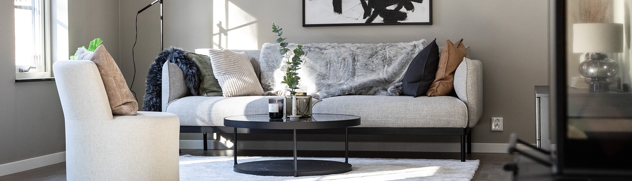 – Vi har möblerat trendigt och valt till detaljer som gråtonat parkettgolv och svartfogat kakel i badrummet för effekt. Vi har också valt en braskamin med en modern glaslucka. Det ska kännas fint och ombonat.