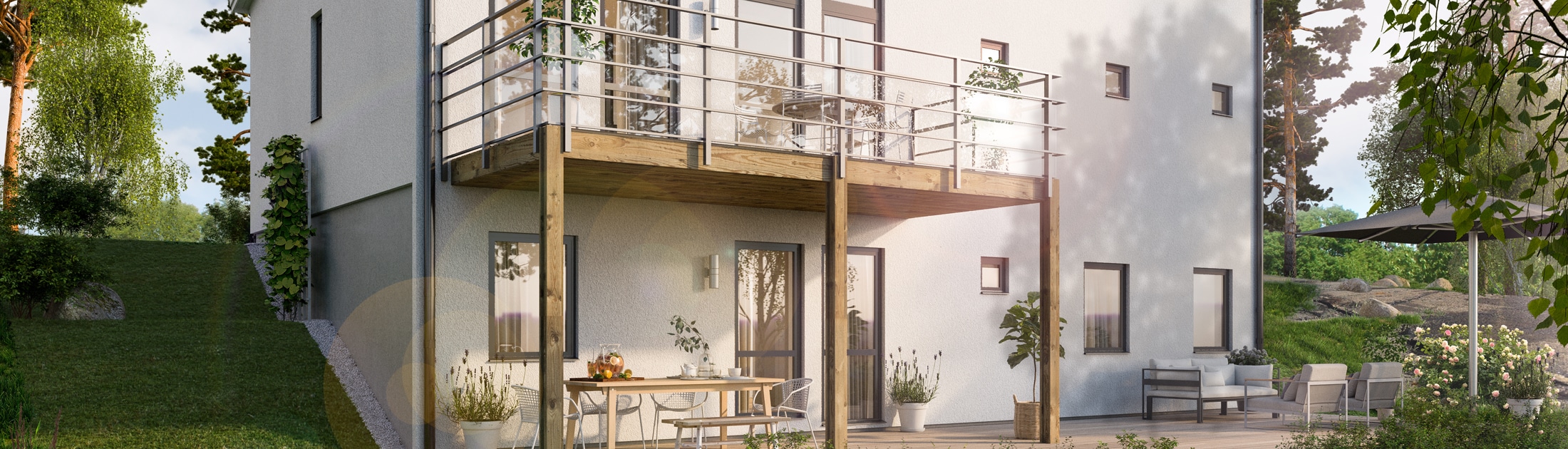 Vår modell LB Optimal 159 är ett pampigt hus med stor, välkomnande hall och möjlighet till fyra sovrum. Det är ett modernt utformat sutteränghus med stora fönster, mycket ljusinsläpp och generösa utrymmen att umgås på. En genomgående tanke i hela huset är smarta utrymmen till förvaring. Med både balkong och uteplats finns det flera möjligheter att njuta av måltider och sociala möten utomhus.