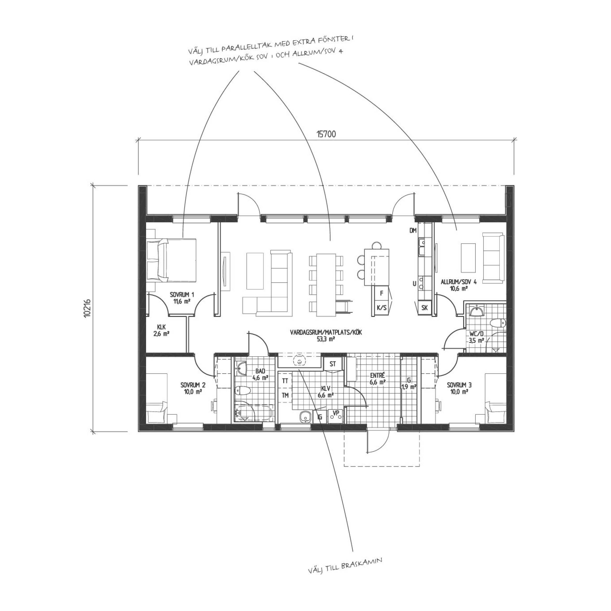 Ett hem för det moderna hushållet. Här ramar överskjutande tak och väggar in baksidan och ger både ett originellt uttryck och vindskyddad uteplats. Baksidans stora fönsterparti får kök och vardagsrum att bada i solljus. I köket ingår praktisk köksö. Välj till eldstad med central placering – för att på bästa sätt ta vara på värmen. De fyra sovrummen är placerade i varsin ände, det största med egen klädkammare. I sin nätta och välplanerade modell passar den här enplansvillan bra även som fritidshus. För ytterligare ljusinsläpp kan du välja till parallelltak med extra fönster ovanpå baksidans ursprungliga fönster.