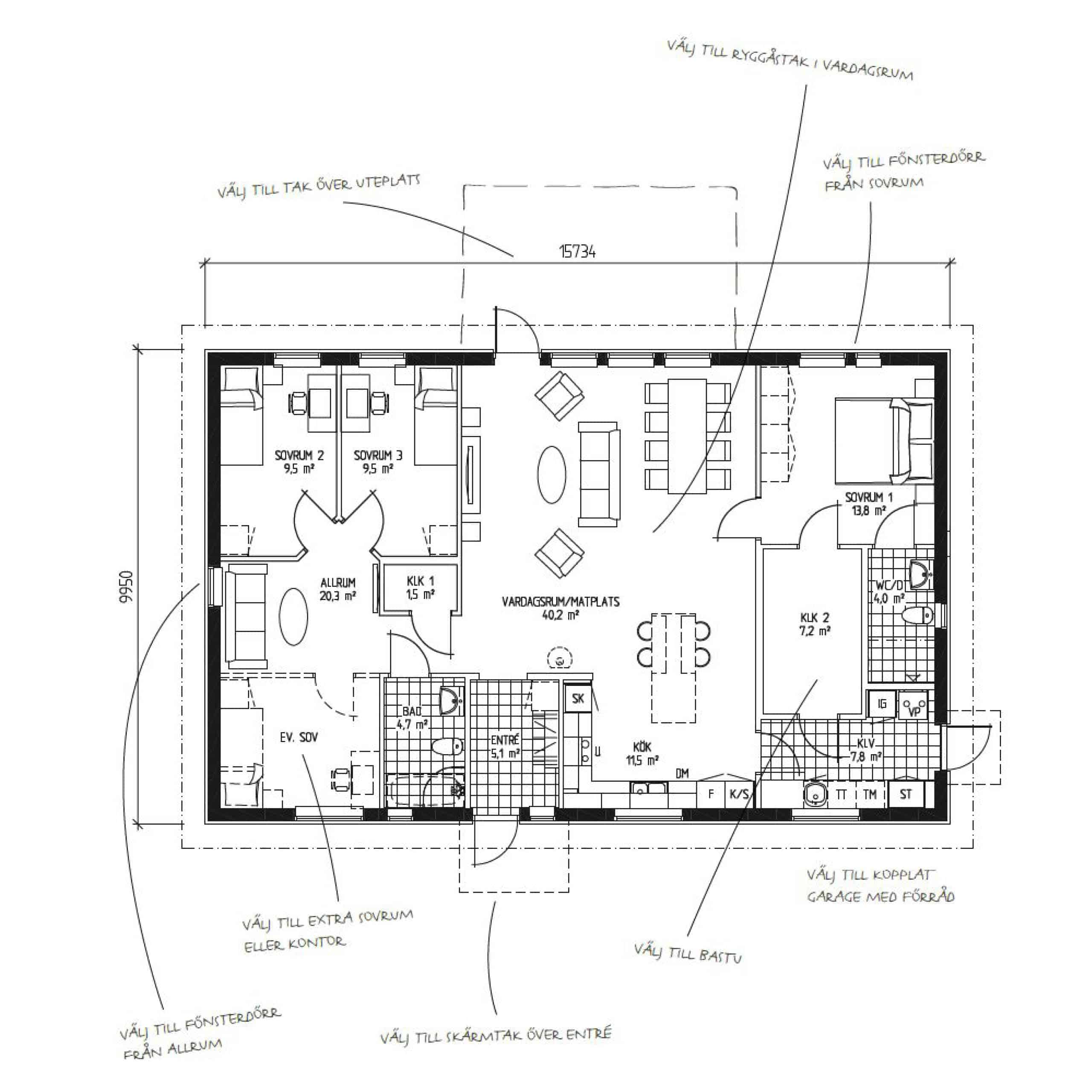 Det här är ett hus med smart planlösning och välutnyttjade ytor. Fönstrens placering ger ett modernt intryck och ett fint flöde av det viktiga ljuset. Här finns många möblerbara väggar och mycket goda förvaringsmöjligheter. En egen avdelning för barn och gäster, de generösa sällskapsytorna och WC/dusch i anslutning till master bedroom, är exempel på ytterligare plus. I tillvalsutbudet hittar du ryggåstak i vardagsrum, tak över uteplats, ett extra sovrum i allrumsdelen, bastu och mycket mer.