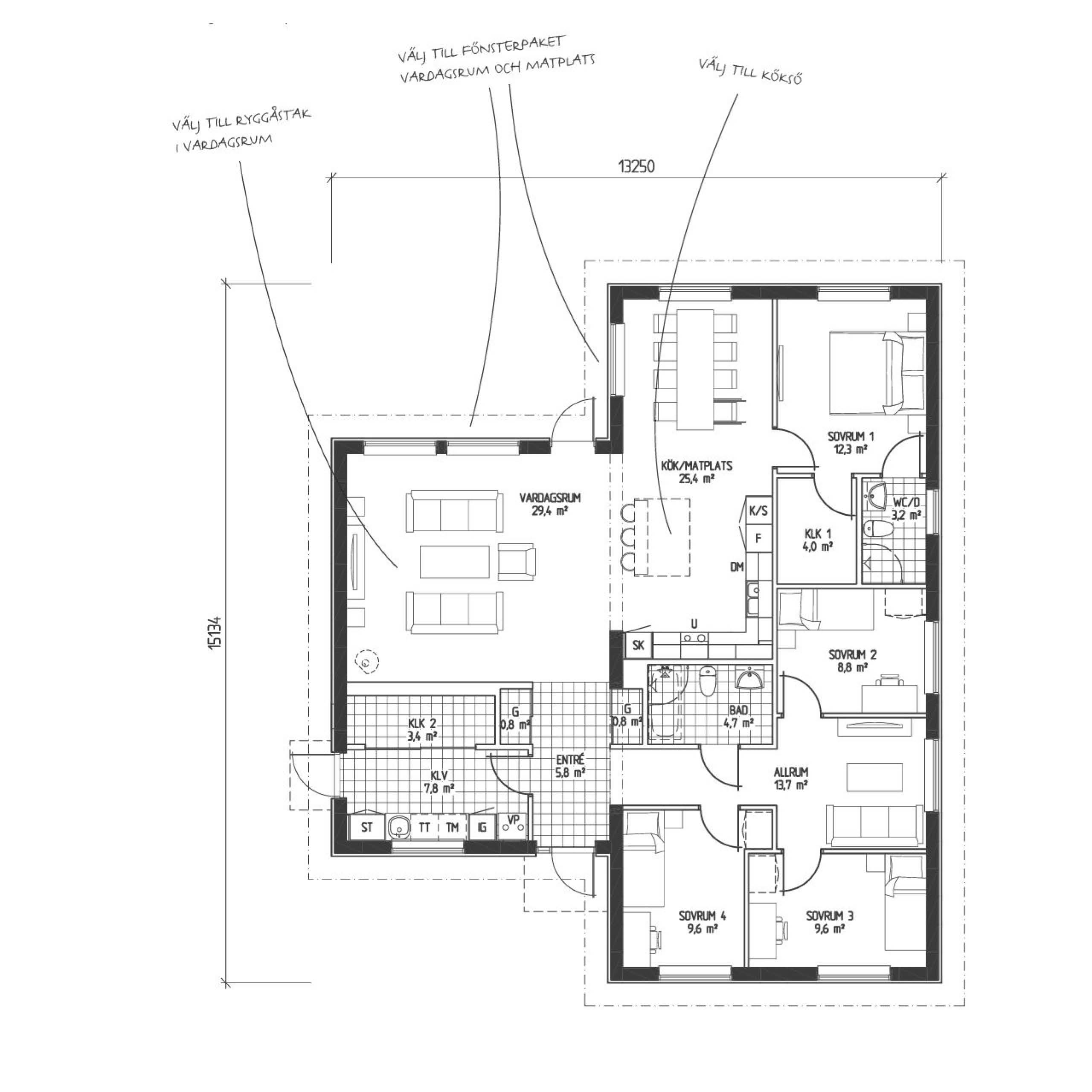 Det här vinkelhuset passar de flesta tomter – och familjekonstellationer. Här är det stora sovrummet avskilt i ena änden av huset, med egen klädkammare och badrum. I andra änden finns ytterligare tre sovrum och gemensamt allrum för lekstunder och myskvällar. Köket är husets centrum, och ansluter till det rymliga vardagsrummet med matplats i vinkel och altandörr som ger en naturlig koppling till baksidan. Tillvalda fönster från golv till tak, eller pampigt ryggåstak i vardagsrum, ger extra öppenhet. Den egna tvättstugan har en rejält tilltagen klädkammare med skjutdörrspari. Välj till kopplat garage med ingång direkt till tvättstugan – särskilt tacksamt under regniga dagar.