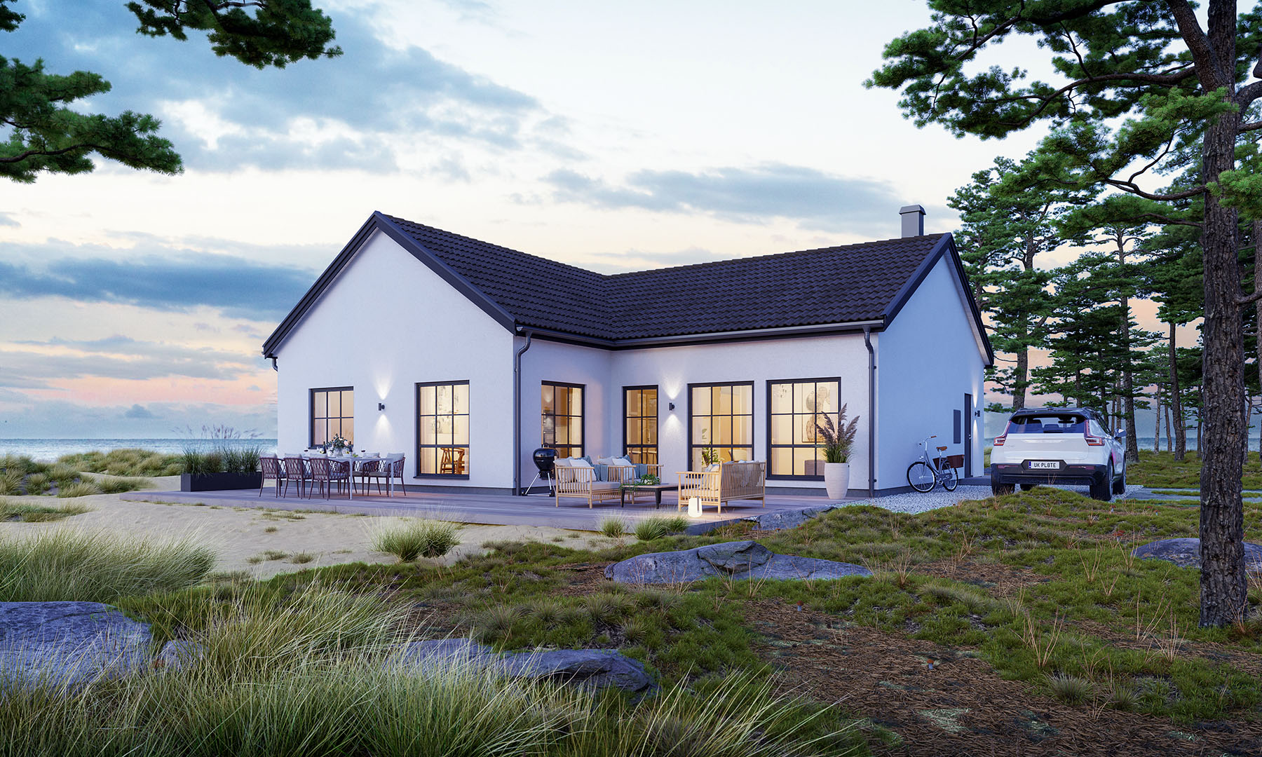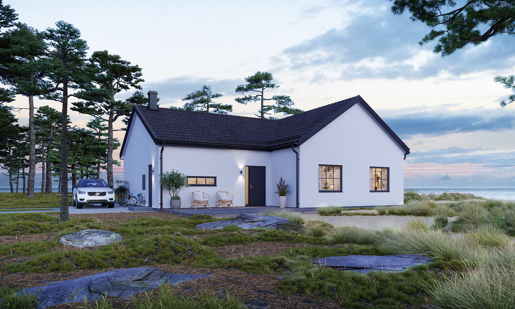 Priset avser standardutförande med vår höga grundstandard på totalentreprenad och inkluderar grundläggning med platta på mark och vattenburen golvvärme samt markarbeten i standardomfattning. Vi förbehåller oss rätten för lokala prisavvikelser med hänsyn till transport- och tillgänglighetssvårigheter, så som vid bl a bro-, tunnel- eller färjeanslutna ögrupper.