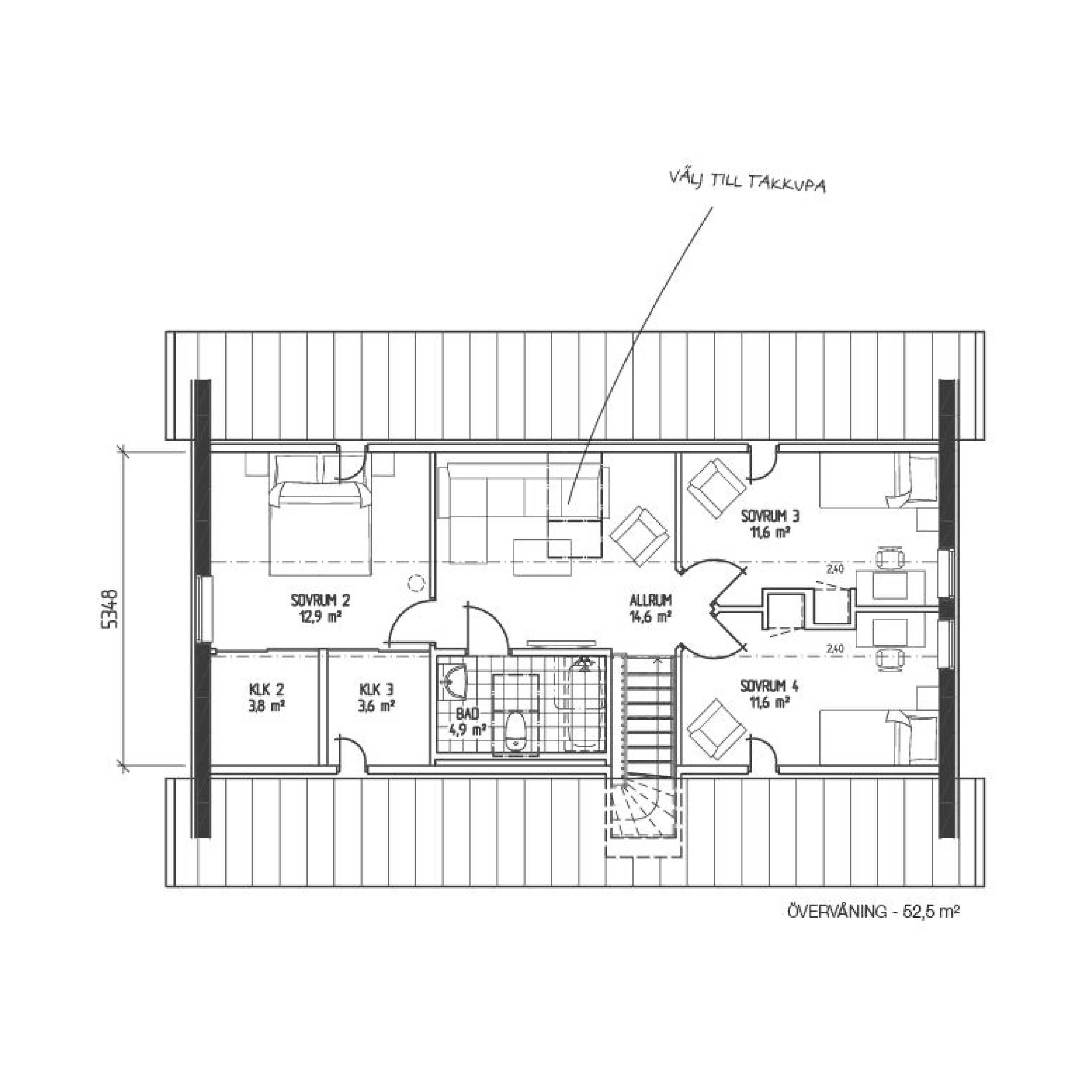 Här finns gott om utrymme för det större hushållet, det märks redan i den rymliga entrén som har mycket plats för förvaring. För att slippa få med grus och smuts upp på övervåningen är trappan förskjuten i riktning bort från ytterdörren. Det här är ett hus med luftig känsla som har rundgång från entré till kök och vardagsrum. Övre plan har en optimerad planlösning med generösa rum och skjutdörrsgarderober i det största sovrummet. På nedre plan finns möjlighet till ett extra sovrum eller en rymlig klädkammare och huset har separata utrymmen för wc/dusch och klädvård. Bland tillvalsmöjligheterna märks fönsterdörr till stora sovrummet, rejäl köksö med sittplatser och stora fönsterpartier i vardagsrum och vid matplats.