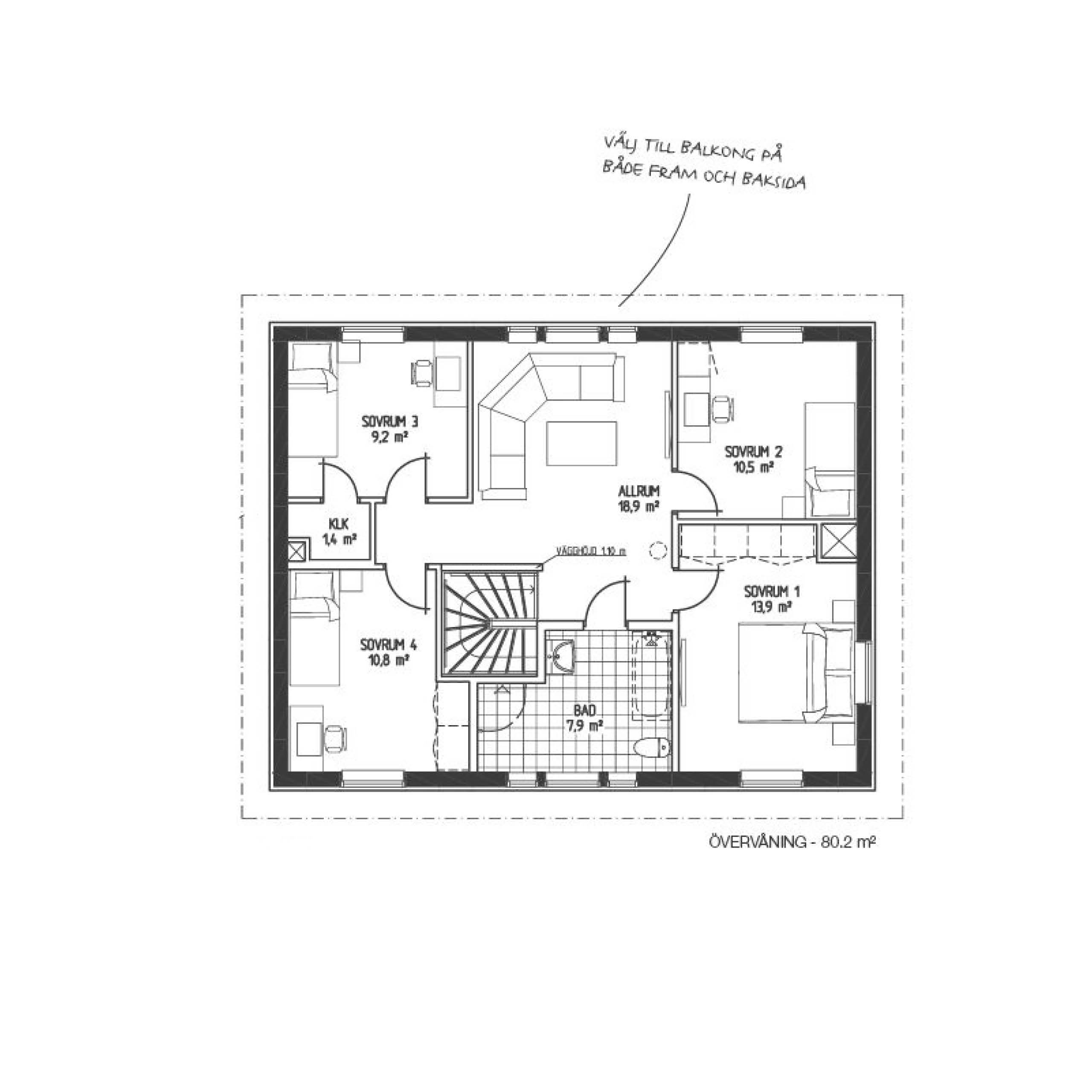 Det här är ett stort och välplanerat hus som är särskilt väl lämpat för mindre tomter. Den klassiskt symmetriska utformningen gör att huset passar fint i de flesta omgivningar. När du kliver in i den rymliga hallen har du fri sikt genom huset, till baksidan, detta tillsammans med trappans centrala placering, gör att huset präglas av ljus och rymd. Här finns gott om förvaringsmöjligheter och fyra sovrum på övervåningen, med möjlighet till ett femte på första våningen, om du vill. Ett hus för det stora och växande hushållet. Eller varför inte välja till burspråk med balkong och frontespis för att få det där lilla extra?