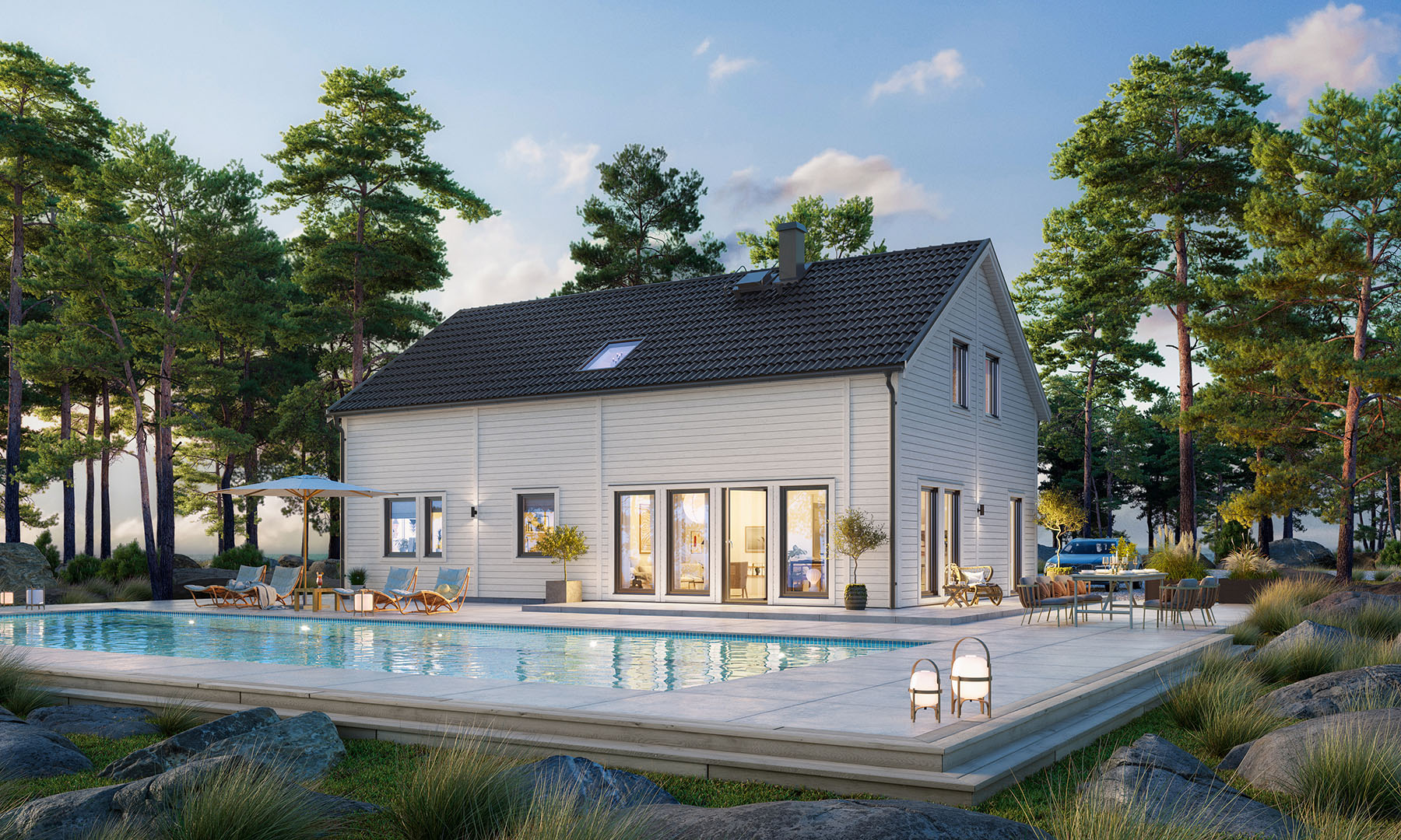 Priset avser standardutförande med vår höga grundstandard på totalentreprenad och inkluderar grundläggning med platta på mark och vattenburen golvvärme samt markarbeten i standardomfattning. Vi förbehåller oss rätten för lokala prisavvikelser med hänsyn till transport- och tillgänglighetssvårigheter, så som vid bl a bro-, tunnel- eller färjeanslutna ögrupper.