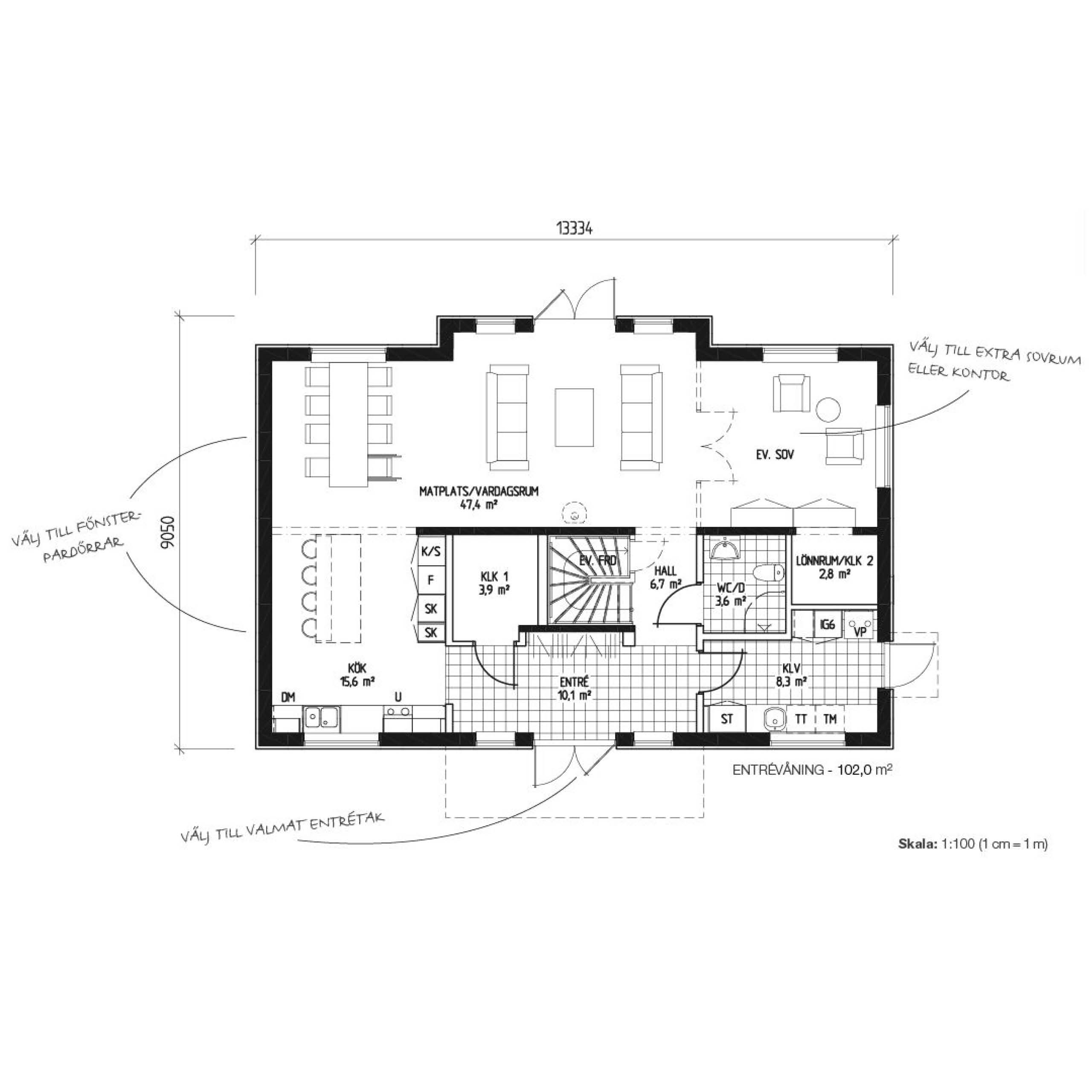 Priset avser standardutförande med vår höga grundstandard på totalentreprenad och inkluderar grundläggning med platta på mark och vattenburen golvvärme samt markarbeten i standardomfattning. Vi förbehåller oss rätten för lokala prisavvikelser med hänsyn till transport- och tillgänglighetssvårigheter, så som vid bl a bro-, tunnel- eller färjeanslutna ögrupper.