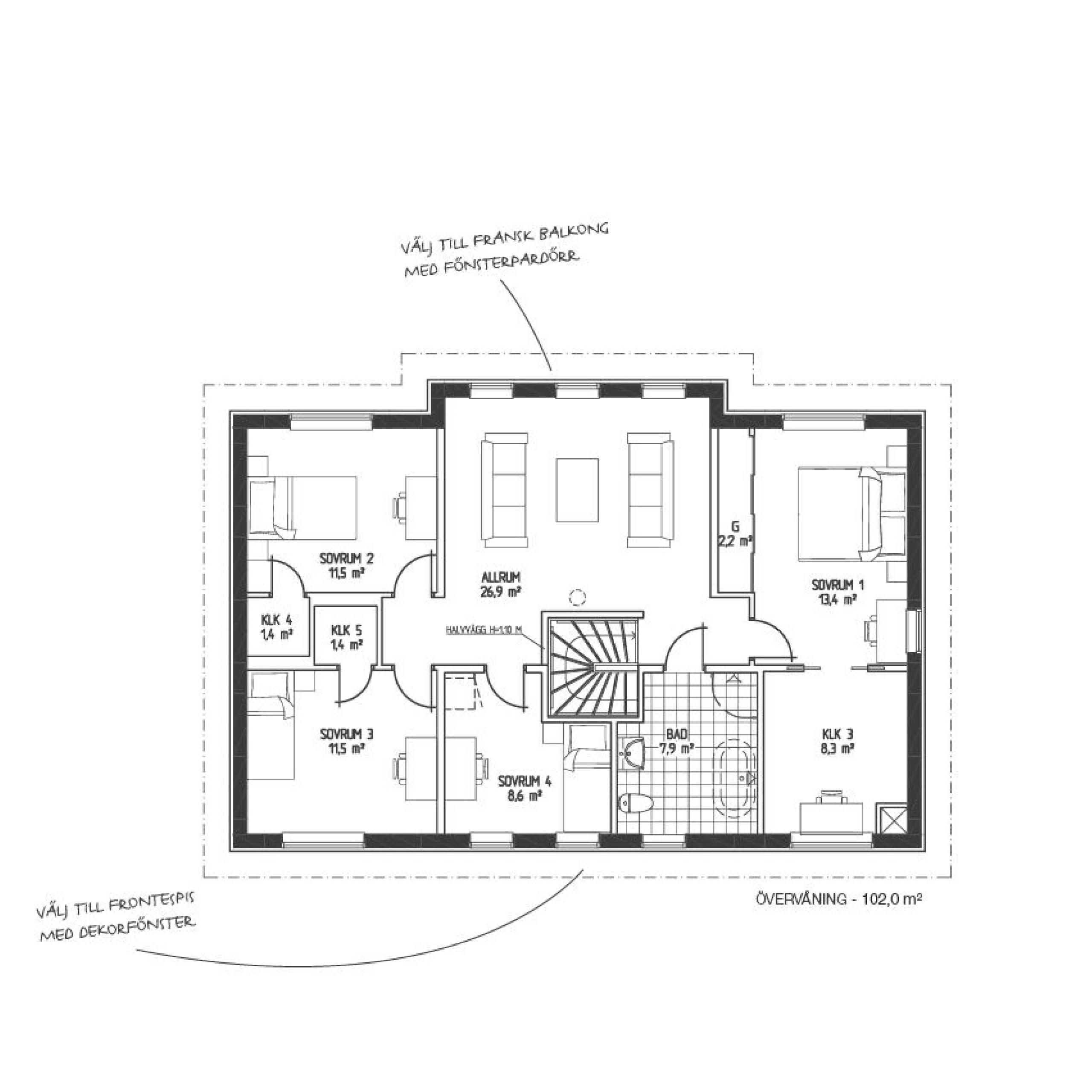 Huset för dig som vill ha extra allt. Generös boarea på två tjusiga våningar. Kliv in i den stora entrén med rymlig klädkammare. På entréplan smälter kök, matplats och vardagsrum ihop i ett. I andra änden kan du bygga till ett bibliotek eller gästrum med klädkammare (eller hemligt lönnrum!). Den centralt placerade trappan ger flexibel rundgång, och leder upp till plan två som rymmer fyra sovrum och ett generöst allrum. Här kan du välja till fransk balkong med fönsterpardörr. Föräldrasovrummet har inbyggd garderob, stor klädkammare och badrum i nära anslutning med möjlighet till både dusch och badkar. Vill du maxa huset ännu mer? Välj till valmat tak och entrétak, frontespis med dekorfönster på gavelspetsarna och extra fönsterpardörrar vid kök och matplats.