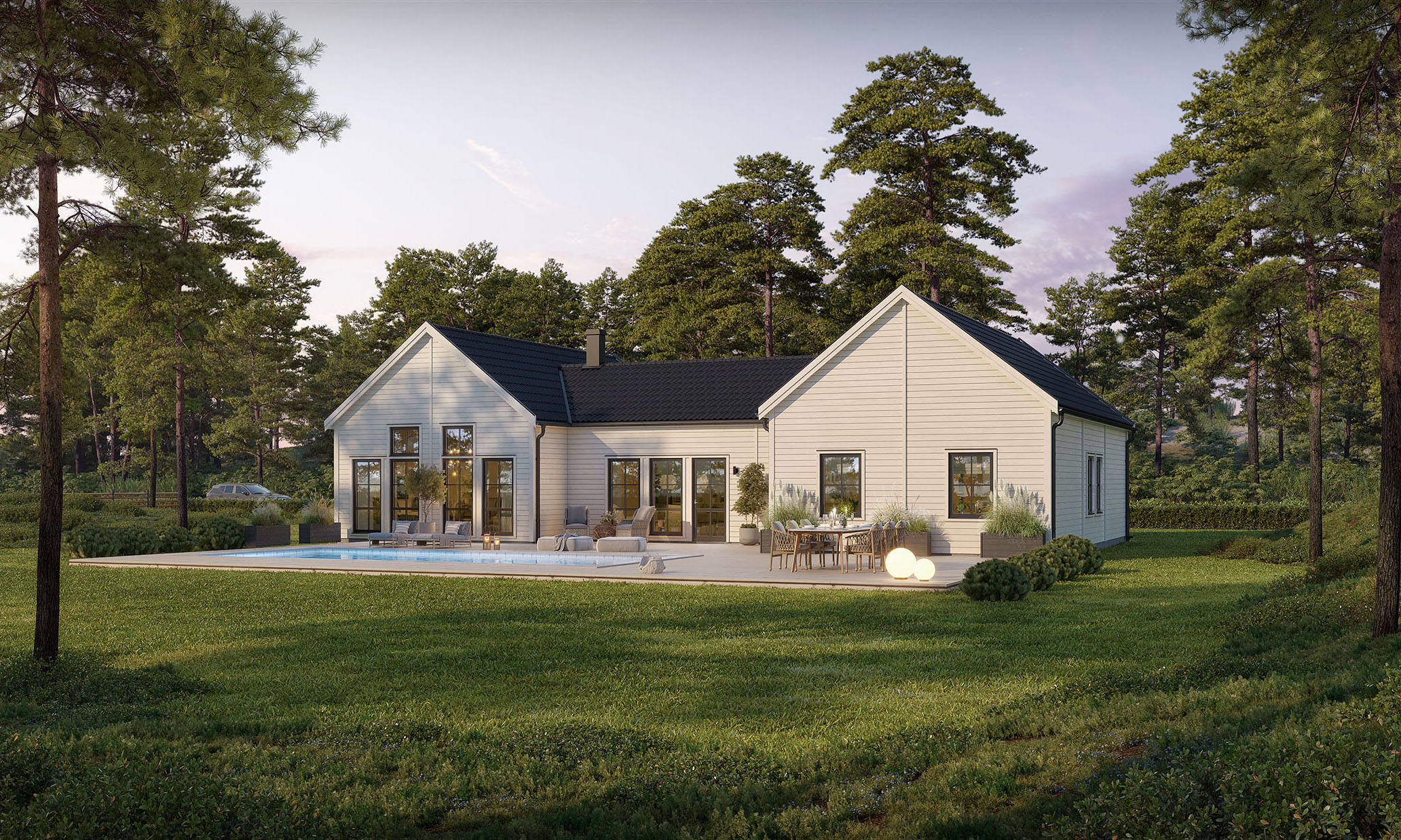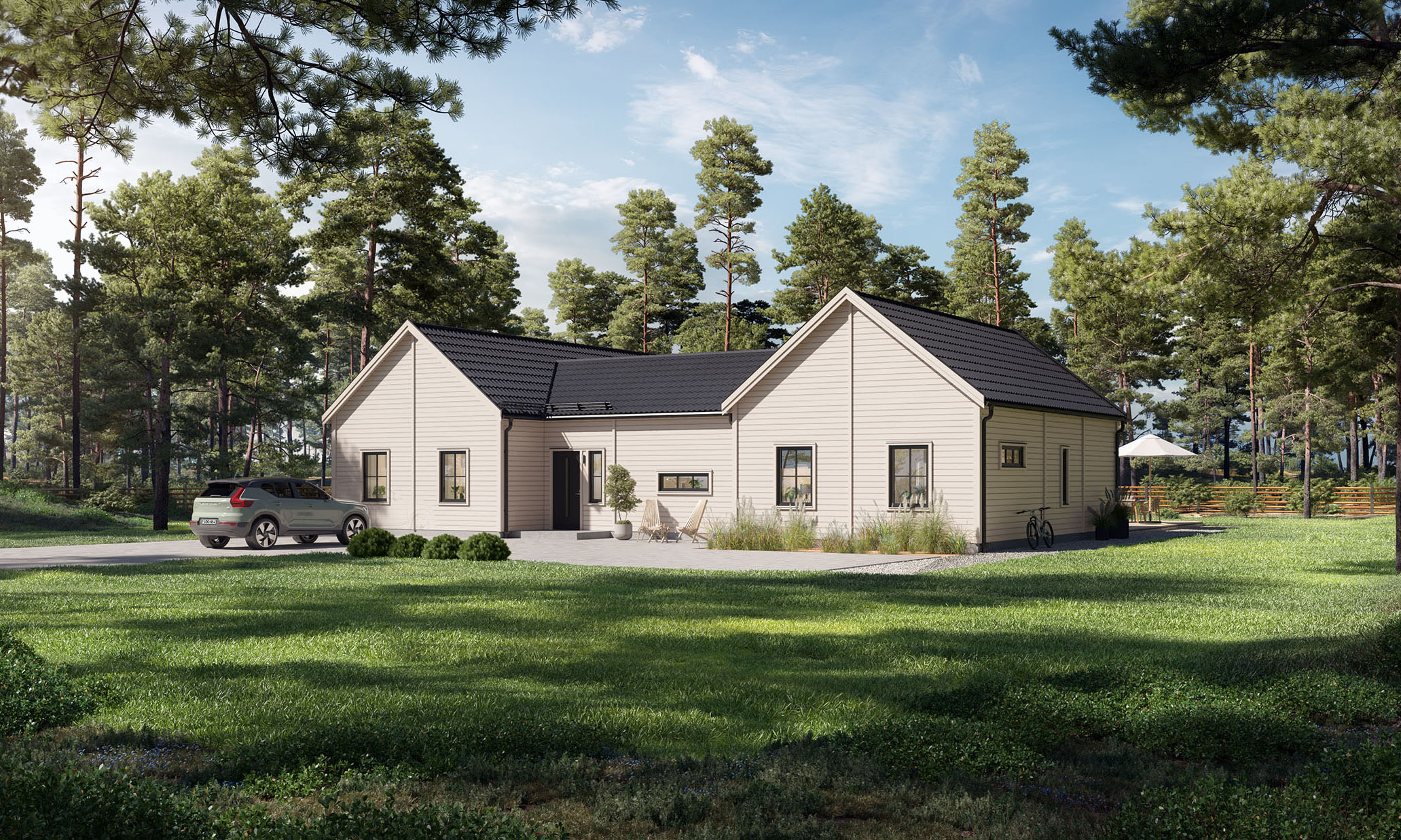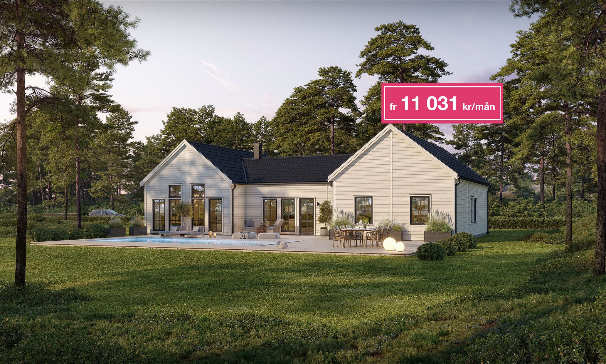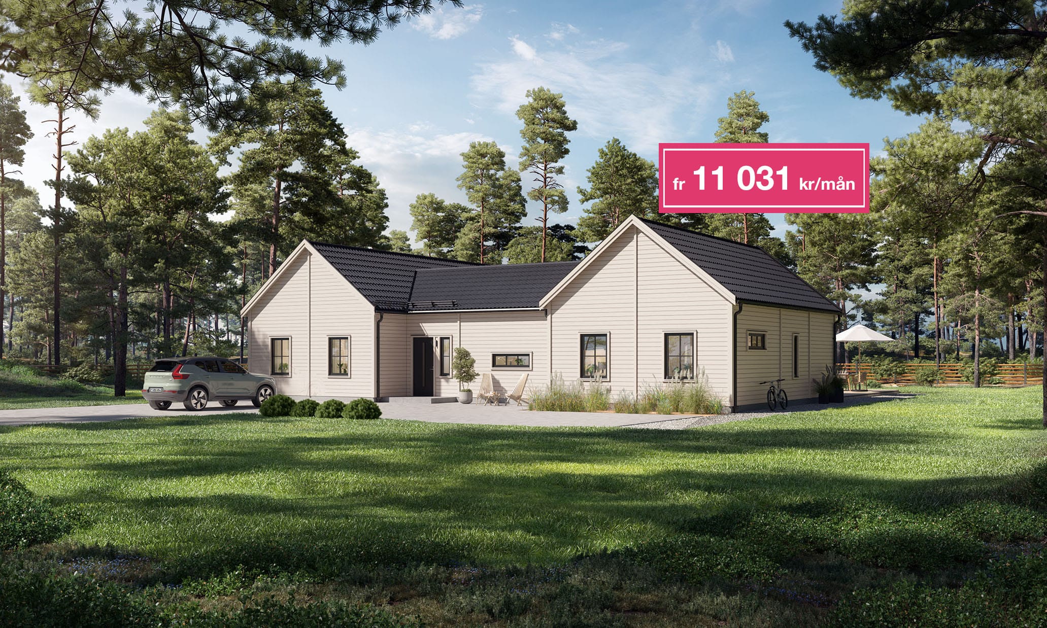 Priset avser standardutförande med vår höga grundstandard på totalentreprenad och inkluderar grundläggning med platta på mark och vattenburen golvvärme samt markarbeten i standardomfattning. Vi förbehåller oss rätten för lokala prisavvikelser med hänsyn till transport- och tillgänglighetssvårigheter, så som vid bl a bro-, tunnel- eller färjeanslutna ögrupper.
