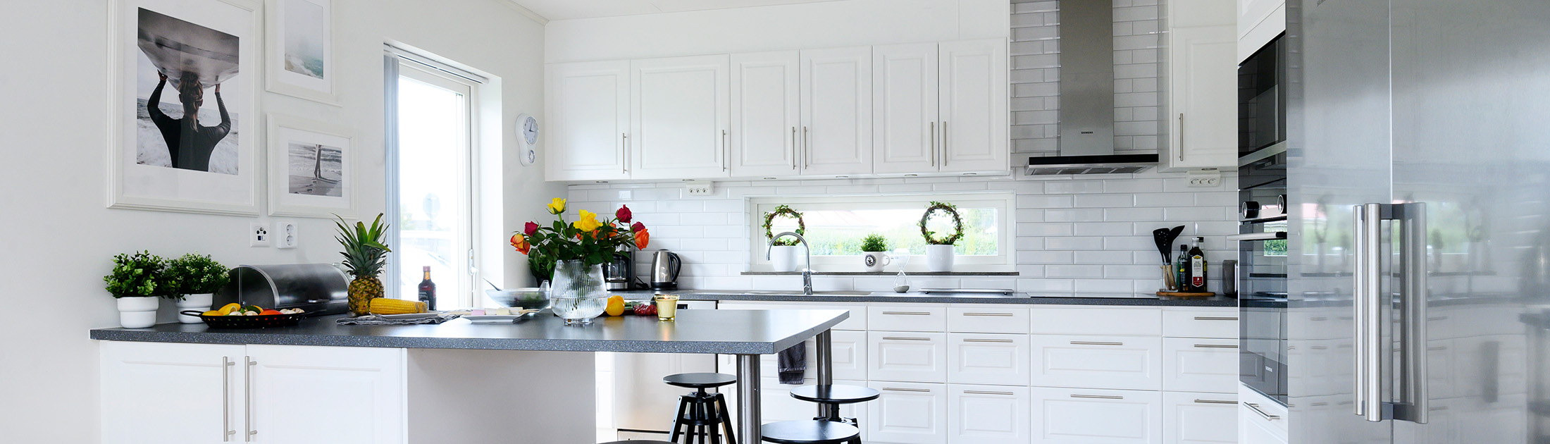 – Ja, det blev en del, vi har ganska höga krav när det gäller funktion och känsla. Vi valde centraldammsugare och formpressade innerdörrar. Vi valde en annan kökslucka och köksö och den är vi väldigt glada för – där sitter vi väldigt ofta, det är liksom kring den vi träffas på dagarna för att äta frukost, baka och laga mat. Och så kaminen! Den gör jättemycket för känslan på den öppna bottenvåningen. Vår tvättstuga är standard men verkligen ett rum som vi uppskattar – bra med utrymme och rejäla material – det tvättas en hel del här hemma och det betyder mycket att det är trevligt.