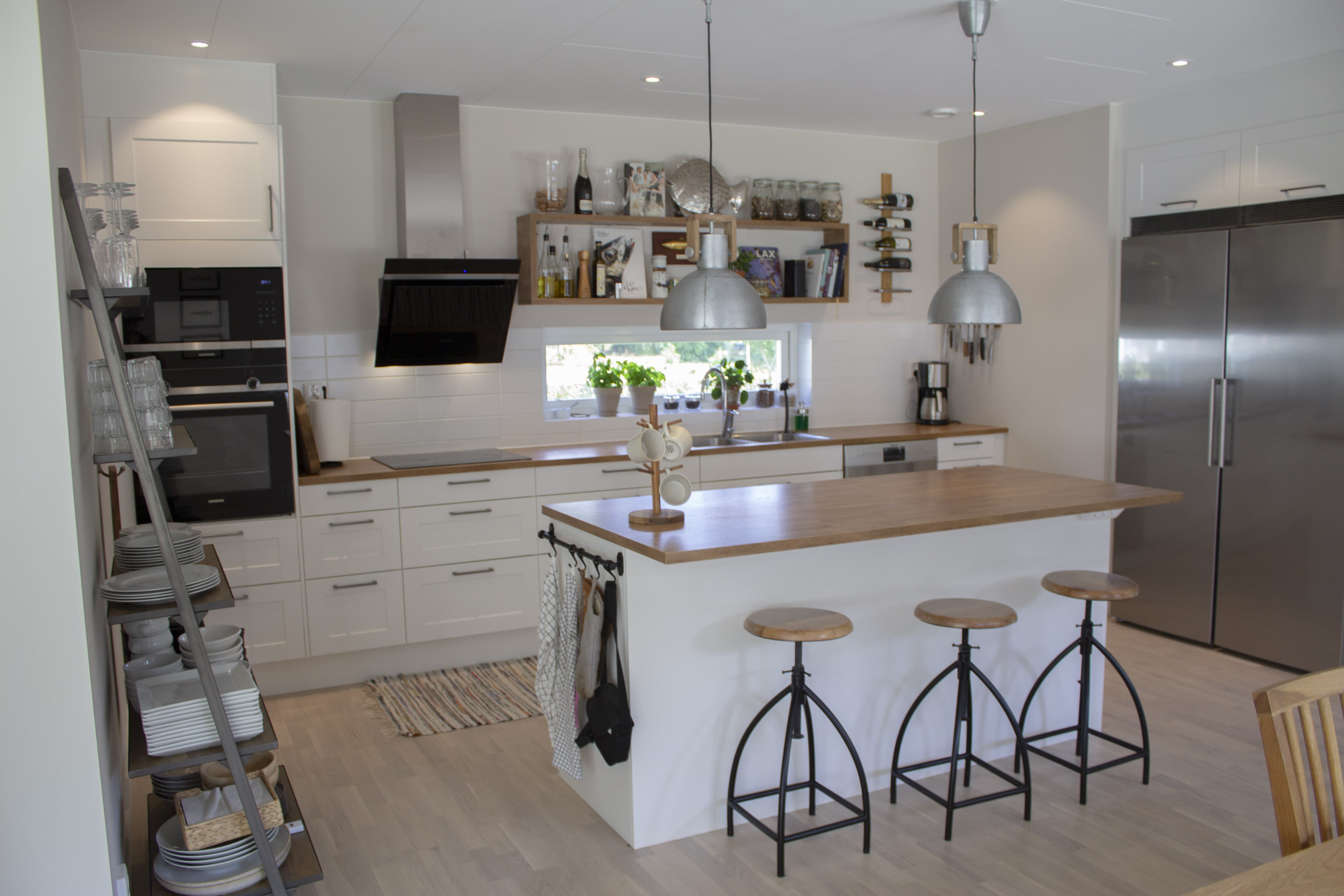 – Vi ville ha ett stort, praktiskt och lättillgängligt kök, så vi har tagit bort alla överskåp och har öppna hyllor. Vi gjorde en del tillval och satsade på rostfria vitvaror, fläkt och induktionshäll. Och köksö! Den ger en skön barkänsla. Vi älskar den, där äter vi många måltider.