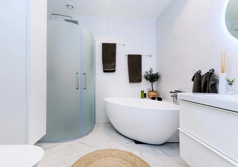 – Med så hög grundstandard är det faktiskt inte mycket mer man behöver, men några tillval gjorde vi: större fönster ut mot däcket för att ta vara på sjöutsikten och ryggåstak som ger rymd. Kamin och badkar för mysfaktorns skull, köksö och spotlights i fönstersmygarna i husets ”sociala ytor”.