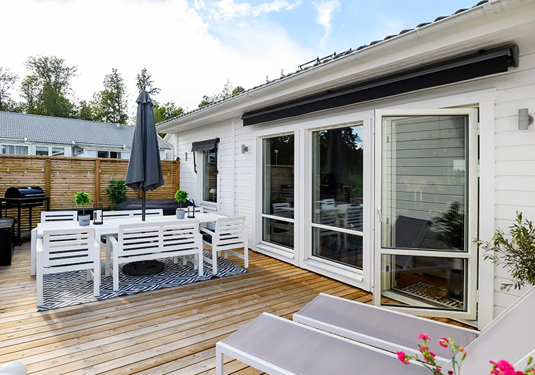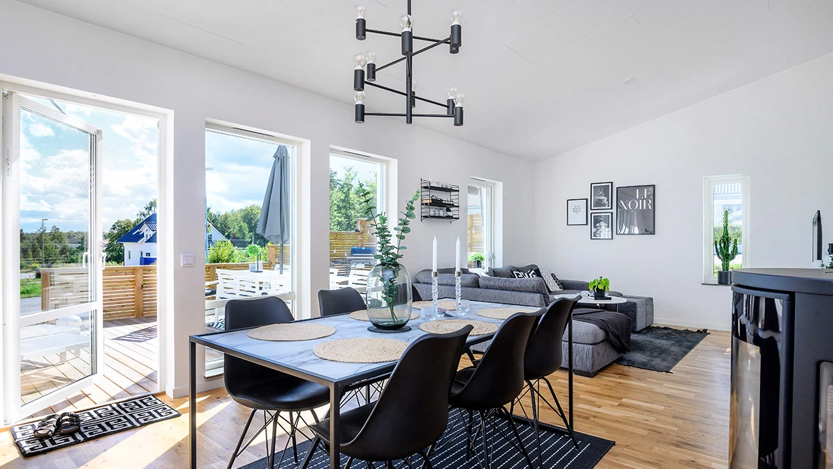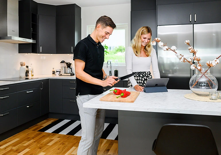– Vi ville ha ett 1-planshus och föll för planlösningen i den här modellen. Att det är öppet men finns möjlighet att stänga en dörr om sig när man vill. Vi har inga barn ännu men vi gillar att huset är tillräckligt stort för en familj samtidigt som det fungerar fint också i framtiden när det bara är vi två igen. Vi tänker långsiktigt.