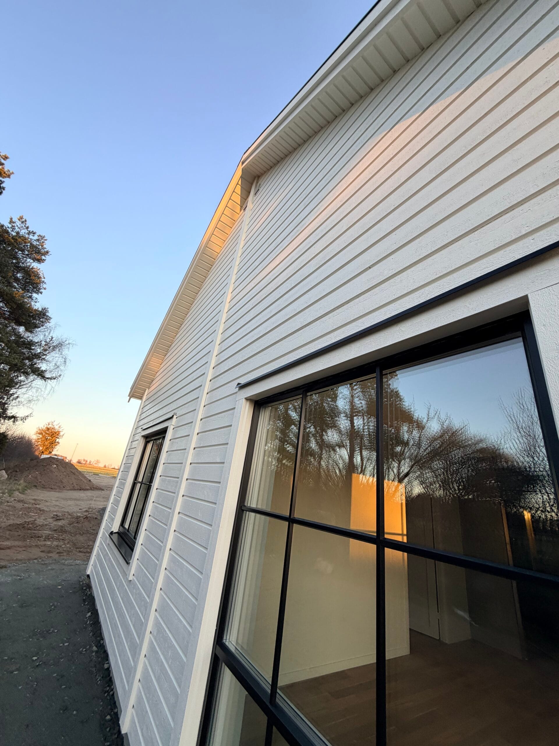 Visningshuset är anpassat och visar tillval som liggande panel, utökade fönsterpartier med färgade fönster. Interiört visas bland annat tillval ryggåstak sam kök med rostfria vitvaror och köksö.