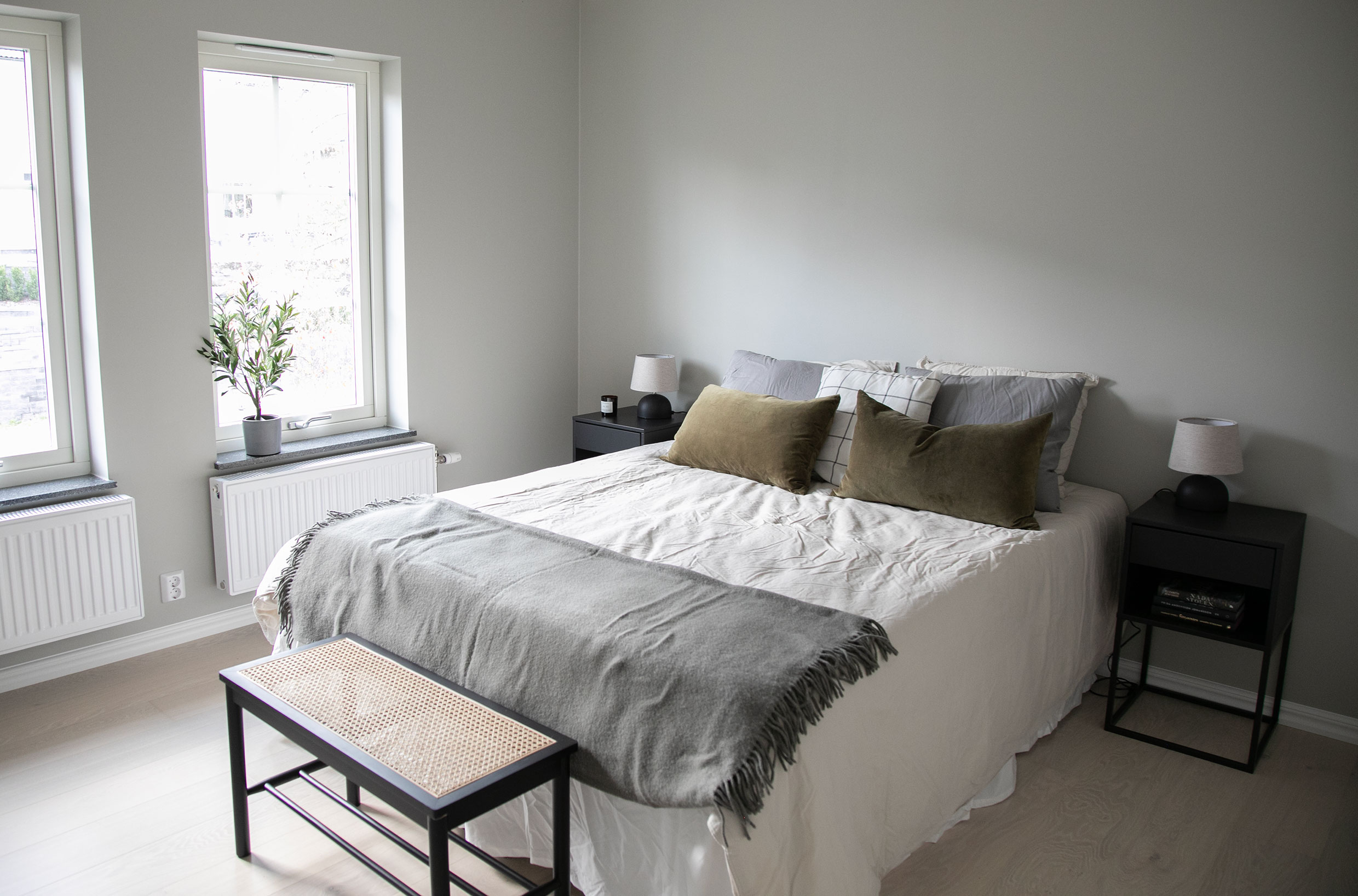 Den vackert rundade trappan till övervåningen tar dig till den mer privata delen av huset. Här finns fyra sovrum, varav tre med egen klädkammare, samt ytterligare ett allrum. I visningshuset har man valt att göra klädkammarna mindre, för att få lite större sovrum. På övre plan är badrummet utrustat med dusch, men också förberett för att kunna installera badkar.